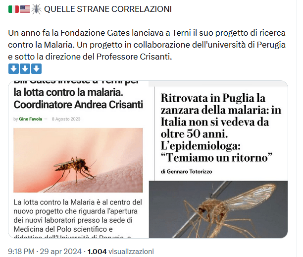 Non esiste alcun collegamento tra gli studi della Fondazione Gates e la scoperta delle zanzare anofele nel Salento, che peraltro non consta di allarme Malaria.