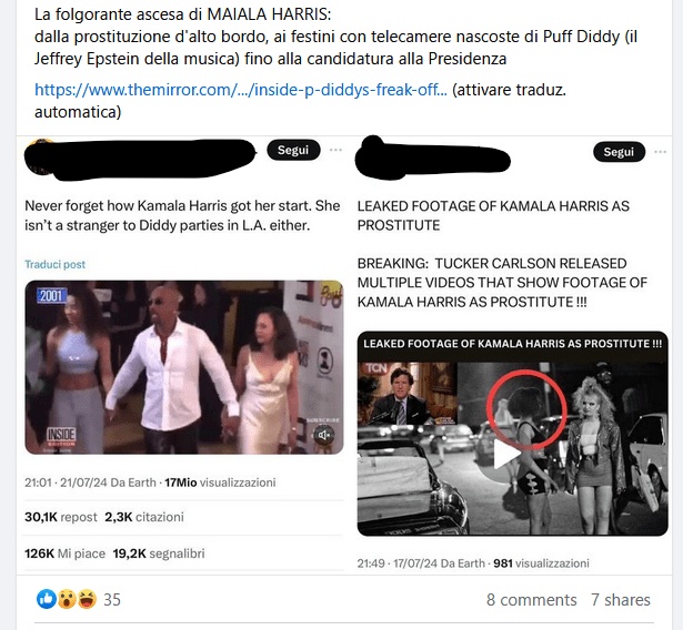 “Kamala Harris è una prostituta”, dichiara un post complottista, e ovviamente fake, che annuncia che l’attuale candidata dem era una prostituta abituata a frequentare i festini di un certo Sean Combs, rapper noto come “P Diddy”, descritto come l’Epstein della musica.