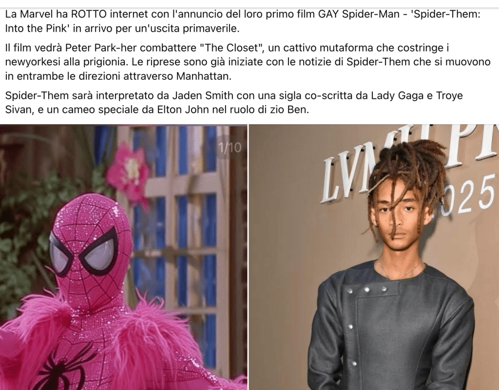 Il post mostra un Uomo Ragno fucsia vestito di Paillettes, il citato “Spider-Them”, annunciando che il personaggio interpretato da Jaden Smith dovrebbe combattere contro “The Closet”, un malvagio cattivo mutaforma che “costringe i New Yorkesi alla prigionia”, con l’aiuto di Zio Ben interpretato da Elton John e le colonne sonore di Lady Gaga.