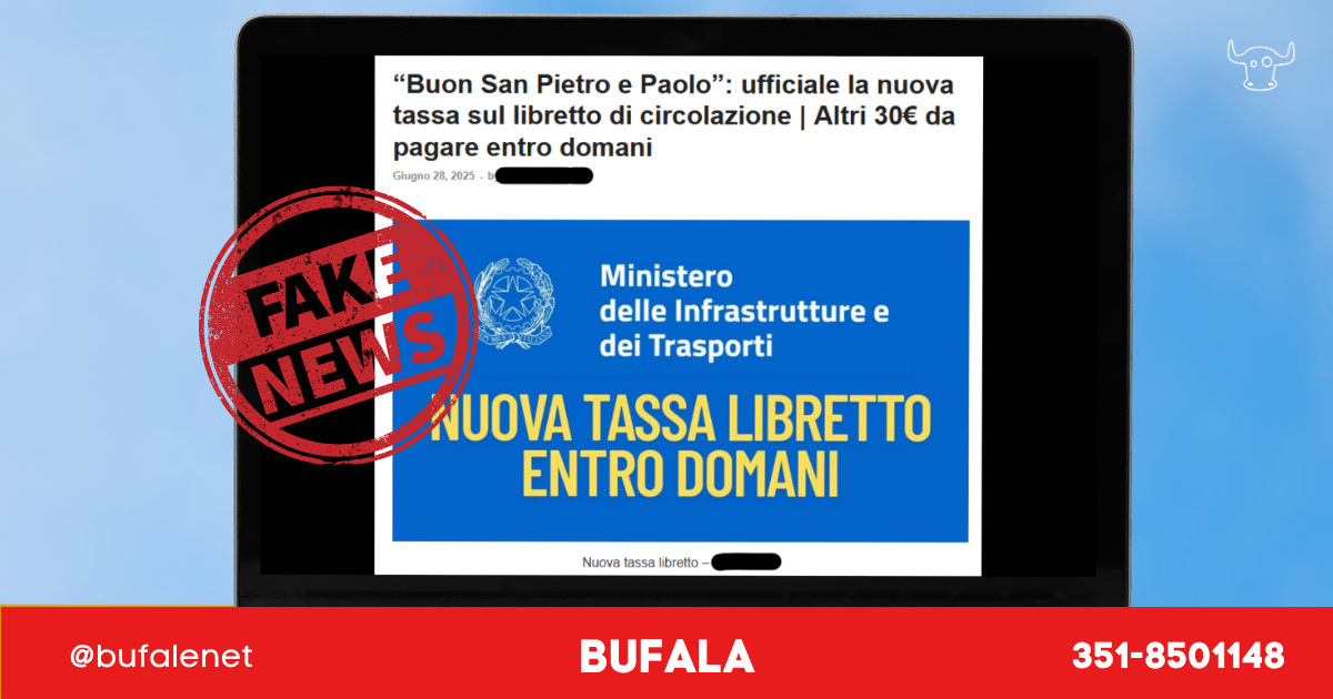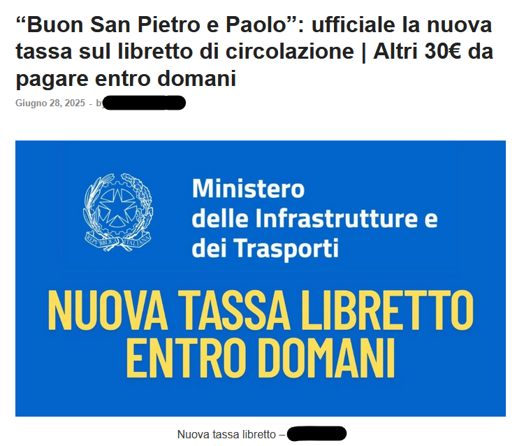 Ci segnalano i nostri contatti un articolo che parla della “Tassa di San Pietro e Paolo per la macchina” da pagare entro il 29 Giugno. Si tratta ovviamente della solita fake news del solito circuito basato su notizie clickbait che titilla l’attenzione inventando dal nulla balzelli giustificati in coda all’articolo.