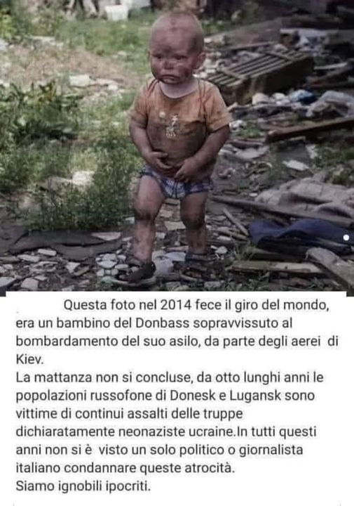 Questa foto nel 2014 fece il giro del mondo, era un bambino del Donbass sopravvissuto al bombardamento del suo asilo, da parte degli aerei di Kiev.