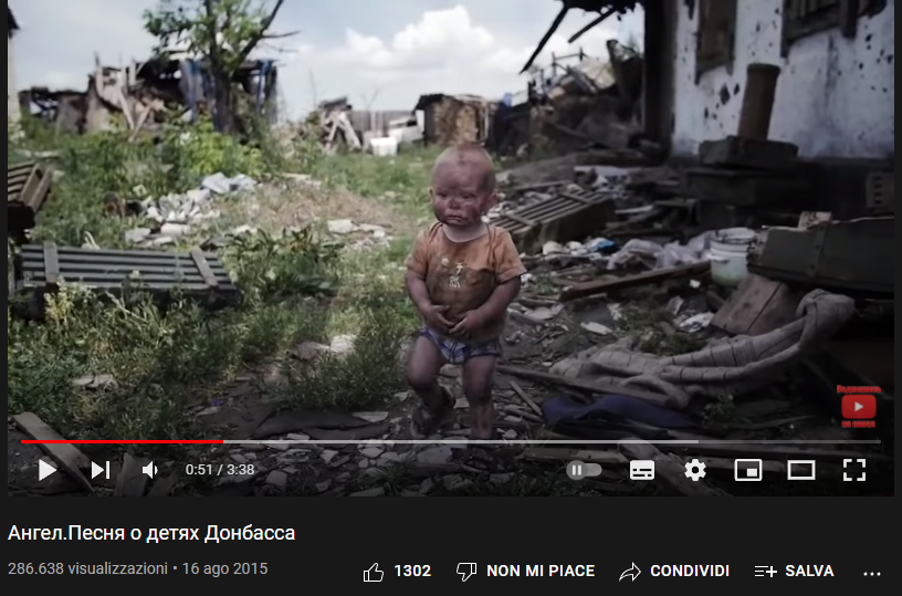 In altre occasioni, la stessa foto è stata usata per condannare la guerra di Gaza e anche la propaganda russa ha utilizzato questa immagine con la stessa narrazione proposta dal post che stiamo analizzando. In realtà ciò che stiamo vedendo è semplicemente il frame di un video musicale dedicato ai bambini del Donbass, e il piccolo protagonista è un interprete delle tante vittime della crisi che, in quell’occasione, partecipò alle riprese insieme alla sorellina. Stiamo parlando del brano Angel: A Song About The Children Of Donbass pubblicato nel 2015, che incorporeremo alla chiusura di questo articolo.