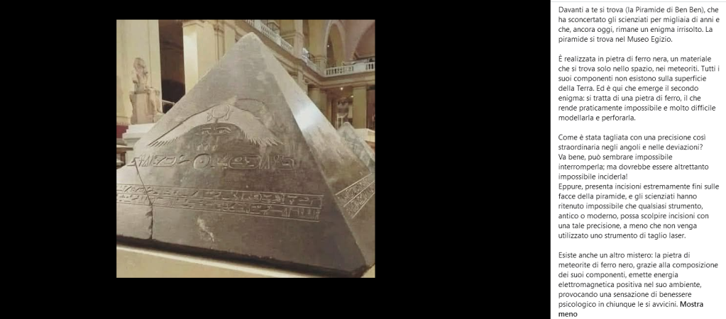 Ci segnalano i nostri contatti una condivisione contenente una misteriosa “pietra benben” di metallo spaziale trovata in Egitto. Secondo tale condivisione sarebbe di “ferro nero”, un materiale cosmico che emana non meglio precisate “enegie positive” che provocano il benessere e che può essere lavorata solo col laser.
