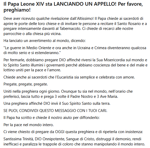Ci segnalano i nostri contatti una preghiera virale di Papa Leone XIV davanti al Tabernacolo: esattamente come è avvenuto in casi precedenti, si tratta di un testo virale precedente falsamente attribuito al Santo Padre perché il suo nome fungesse da traino virale.