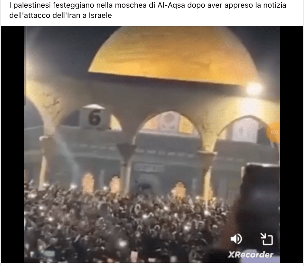 Ci segnalano i nostri contatti un video che dovrebbe raffigurare palestinesi che festeggiano l’attacco dell’Iran nella moschea di Al-Aqsa.