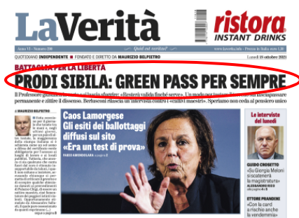 Sulla prima pagina del quotidiano La Verità del 18 ottobre 2021 compare in bella vista il titolo: “Prodi sibila: green pass per sempre”. La versione online dell’articolo a firma di Maurizio Belpietro è riservata agli abbonati, ma su InfoSannio troviamo la versione in chiaro. In poche parole, Belpietro attribuisce a Romano Prodi la proposta di adottare il green pass in maniera definitiva, “per sempre”.