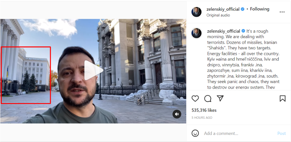 Queste notizie sono state diffuse il 10 ottobre, ma nello stesso giorno Zelensky ha pubblicato un video girato all’esterno del palazzo presidenziale di Kiev. I colleghi di Myth Detector fanno notare che nel filmato girato dal leader ucraino è possibile vedere l’installazione YOUkraine posizionata proprio di fronte al palazzo.