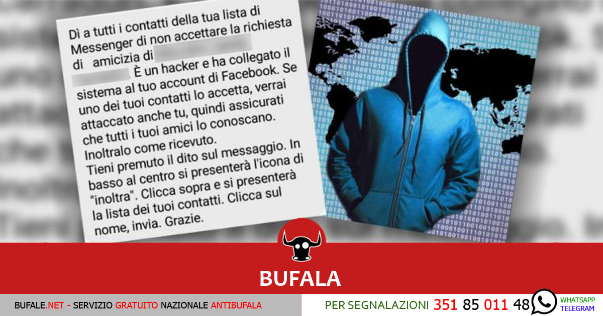 Dì a tutti i contatti della tua lista di Messenger di non accettare la richiesta di amicizia di M******* L****** C*********. È un hacker e ha collegato il sistema al tuo account di Facebook. Se uno dei tuoi contatti lo accetta, verrai attaccato anche tu, quindi assicurati che tutti i tuoi amici lo conoscano. Inoltralo come ricevuto.