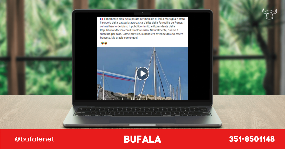 Secondo un video virale le Frecce Tricolori hanno creato la bandiera russa in Francia. Ovviamente si tratta di un semplice gioco di prospettive: essendo i giochi di colore delle Frecce tridimensionali, da una determinata angolazione è normale che i colori si confondano.