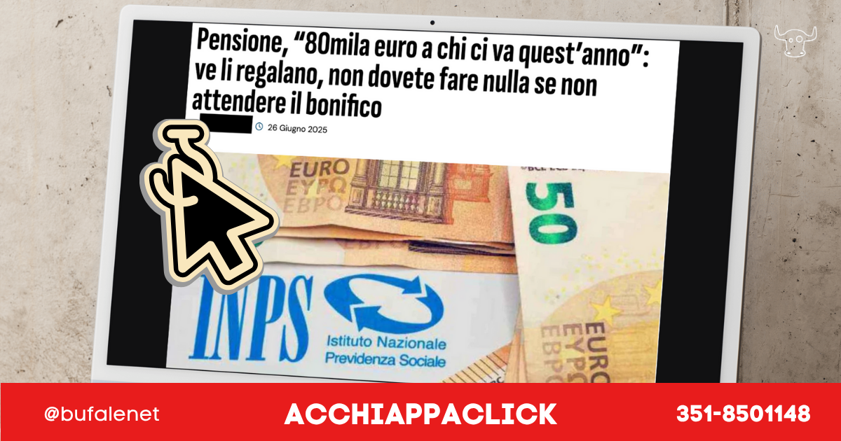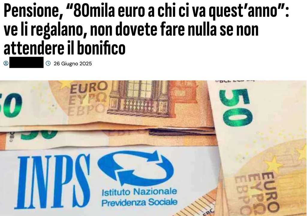 Ci segnalano i nostri contatti un evidente caso di clickbait legato ad un “bonifico di 80mila euro ai pensionati” che vanno in pensione quest’anno. Il solito articolo del solito circuito basato su notizie clickbait che attira l’attenzione con titoli variamente sfacciati.