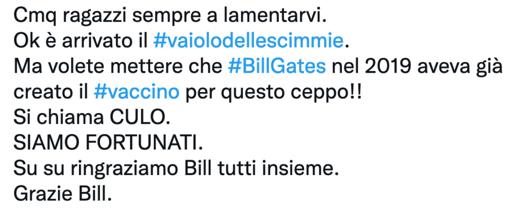 Esempio di tweet sul complotto del Vaiolo delle Scimmie nato nel 2019 (e non c’entra Bill Gates)