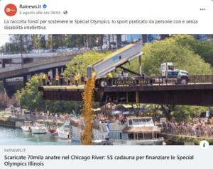 Vi parliamo di una (bella) notizia proveniente dagli Stati Uniti: nei giorni scorsi, nel Chicago River, sono state scaricate ben 70mila papere di gomma, nel contesto di “Duck Race”, una lodevole iniziativa di finanziamento delle Special Olympics, che rappresentano il movimento internazionale dello sport praticato da persone con disabilità intellettiva. Ogni paperella può essere “adottata” al costo di 5 dollari da migliaia di benefattori che sono stati protagonisti di una raccolta fondi che ha raggiunto la cifra di 400.000 dollari. Le paperelle, una volta scaricate in un’area delimitata, effettuano dunque una sorta di gara fino a tagliare un traguardo.