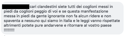 cari clandestini siete tutti dei coglioni messi in piedi da coglioni peggio di voi e se questa manifestazione messa in piedi da gente ignorante non fa alcun ridere e non spaventa a nessuno qui siamo in italia e le leggi vanno rispettate altrimenti potete pure andarvene e ritornare al vostro paese !!!!!!!!!