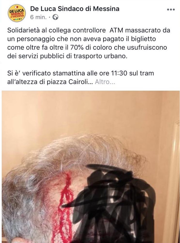 Letteraemme ci fa notare che la stessa foto era stata condivisa dal sindaco di Messina Cateno de Luca e attribuita a un altro fatto di cronaca avvenuto a Messina, dove un controllore ATM è stato colpito da una testata da un passeggero di origini calabresi. De Luca aveva dunque condiviso la foto riferendosi, però, all’episodio di Messina: