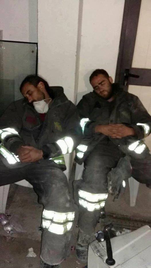 La foto ritrae dunque una vera condizione di riposo di due vigili del fuoco stremati dalle operazioni. La nostra precisazione intende solamente aggiungere i dati che contestualizzano e collocano lo scatto.