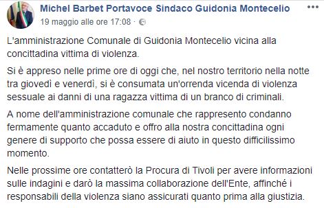 Il sindaco di Guidonia Montecelio, Michel Barbet, ha espresso solidarietà alla donna in un post pubblicato sulla sua pagina Facebook il 19 maggio:
