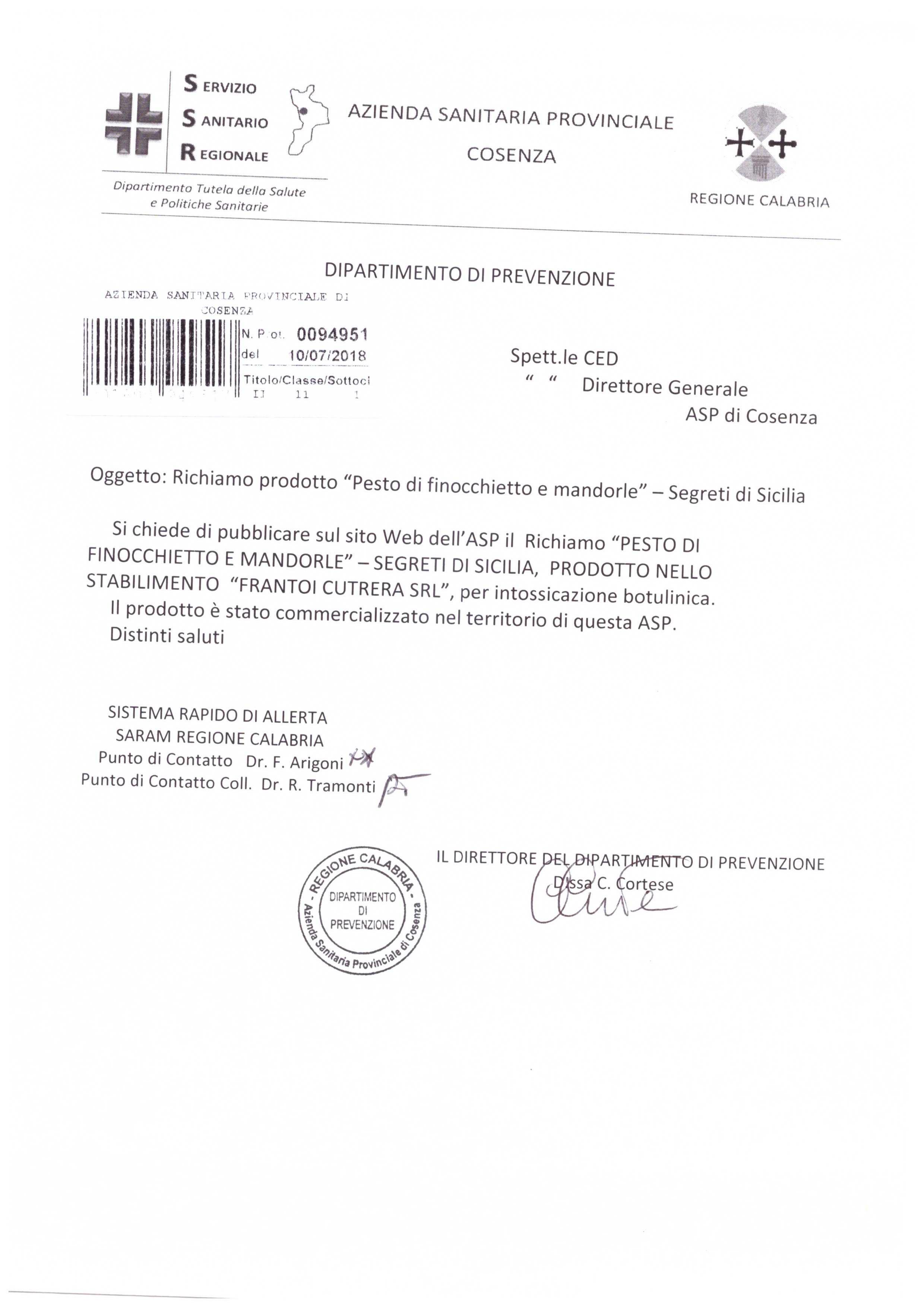 Ci segnalano una circolare firmata dall’ASP (Azienda Sanitaria Provinciale) di Cosenza contente un richiamo di un prodotto per sospetta intossicazione da botulino: