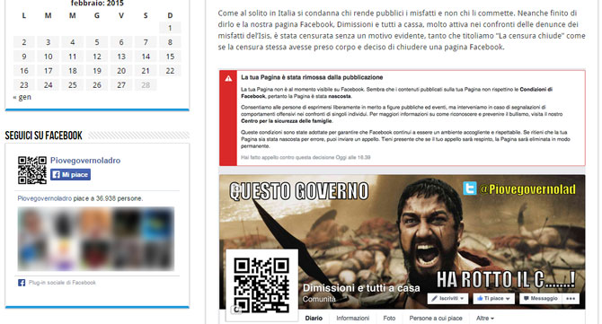 Ecco cosa riporta Piovegovernoladro.info in merito alla rimozione della pagina, che raccoglieva oltre 180 mila “mi piace”: