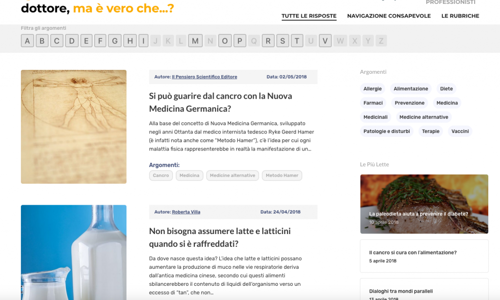 Il primo è il portale Dottore… ma è vero che?, un vero e proprio motore di ricerca, sullo stile di Google, che fornisce una raccolta di articoli e brani semplici nella loro lettura, che possono anche essere letti in elenco alfabetico