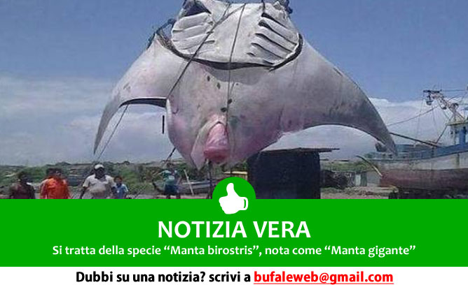 Ci chiedono di verificare la veridicità della foto e della notizia apparsa in alcuni siti online tra cui Leggo.it lunedì 27 aprile 2015, con l’articolo dal titolo “Manta gigante catturata da un pescatore: pesa 1000 kg, sollevata con la gru“.