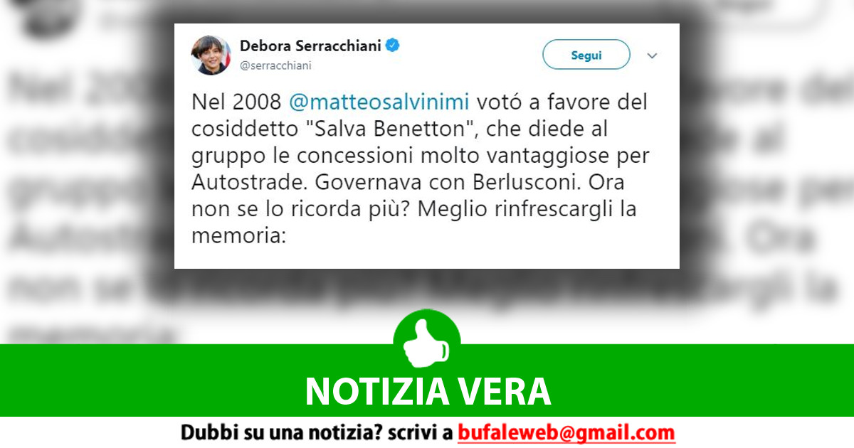 In questi giorni si discute moltissimo non solo delle responsabilità dirette per il crollo del Ponte Morandi a Genova, ma anche dell’iter legislativo che ha consentito a Benetton di avere pieno potere in merito ad Autostrade, con relativo approfondimento su Salvini. Il motivo? Nelle ultime ore Debora Serracchiani ha pubblicato un tweet, con cui ha fatto sapere a tutti che nel 2008 l’attuale Ministro dell’Interno votò a favore del “Salva Benetton“, con cui il noto marchio ebbe importanti concessioni sulla gestione proprio di Autostrade.
