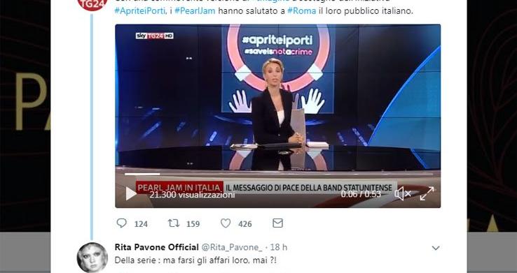 Rita Pavone balzò all’attenzione dei social media quando, dopo il concerto dei Pearl Jam tenutosi il 26 giugno allo Stadio Olimpico di Roma, contestò il messaggio lanciato dalla band sulle note della cover di Imagine di John Lennon proiettando sul maxischermo l’hashtag #ApriteIPorti.