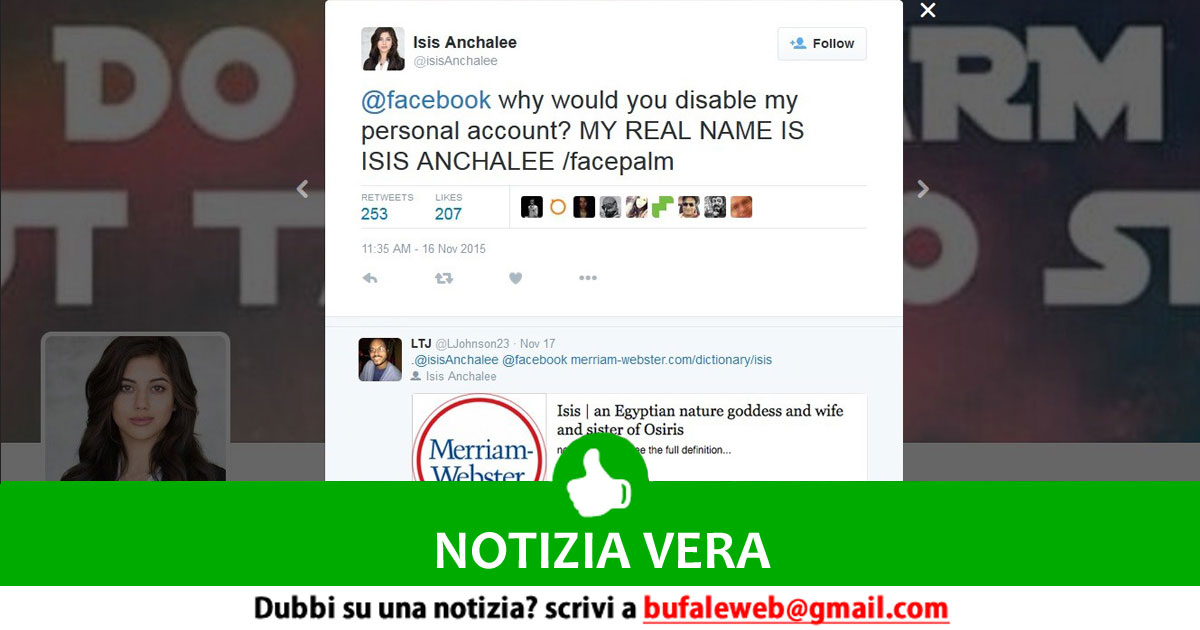 L’articolo del sito Tgcom24, datato 18 Novembre 2015, riporta le vicende di Isis Anchalee, programmatrice di San Francisco, a cui Facebook avrebbe bloccato l’account il 16 Novembre 2015, come riporta questo Tweet di lamentela.