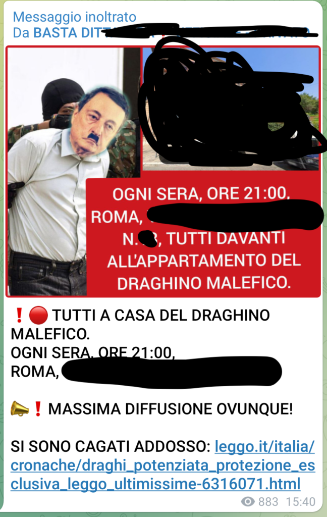 L’ennesimo appello in stile “armiamoci e partite”, la “prova di coraggio” chiesta agli adepti per ottenere il grado di guerrieri, prevede sfidare le scorte per recarsi all’indirizzo di casa di Draghi, messo in chiaro, e “farlo cagare addosso”.