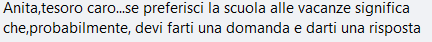 Anita,tesoro caro…se preferisci la scuola alle vacanze significa che,probabilmente, devi farti una domanda e darti una risposta