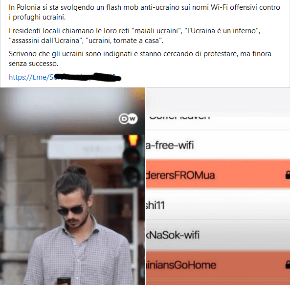Nella narrazione del tutto inventata i polacchi avrebbero cambiato in massa il nome del loro Wi-Fi in “Ucraini maiali”, “Ucraini tornate a casa”, “L’Ucraina è l’inferno” e altri insulti (peraltro tutti in lingua inglese…) e i rifugiati avrebbero protestato col governo polacco vedendo le loro richieste rifiutate.