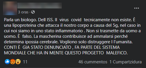 In questo post altamente sgrammaticato troviamo tutte le tipicità del bufalaro complottista: 5G, negazione dell’esistenza del virus, distruzione dell’umanità e l’esilarante trasformazione del premier Giuseppe Conte in “Conti”. La persona che ha pubblicato questo post viene attaccata da più fronti da utenti che chiedono a gran voce le fonti delle sue affermazioni. La stessa persona risponde di essere in possesso di prove, ma alle richieste di esibirle non risponde.