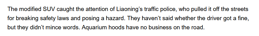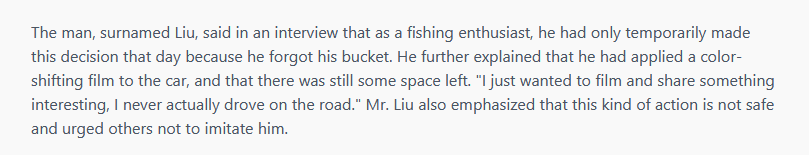 In un passaggio successivo della storia però Vice, sia pur citando espressamente l’articolo locale che ne parlava, ha ritoccato la storia modifica la parte in cui Liu dichiara di non aver mai condotto il veicolo su strada e che la polizia ha confermato che ove lo avesse fatto sarebbe stato sanzionato, inserendo il dettaglio per cui Lui avrebbe invece guidato il mezzo e sarebbe stato “pizzicato” dalle autorità.