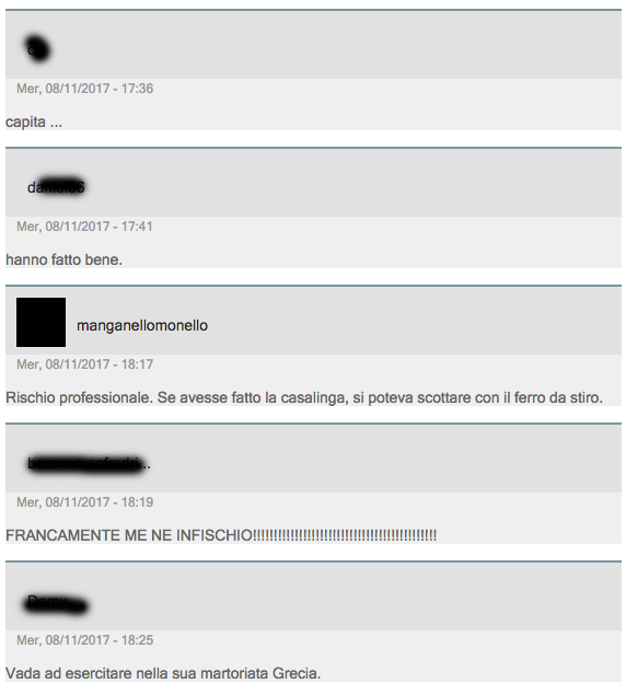Ma i commenti dei lettori sulla notizia riportata da Il Giornale elevano quel victim blaming a perversa forma d’arte. Ne riporteremo solo i primi: è un elenco di commenti brutali e violenti che cresce di minuto in minuto, e che abbiamo archiviato al momento della stesura dell’articolo.