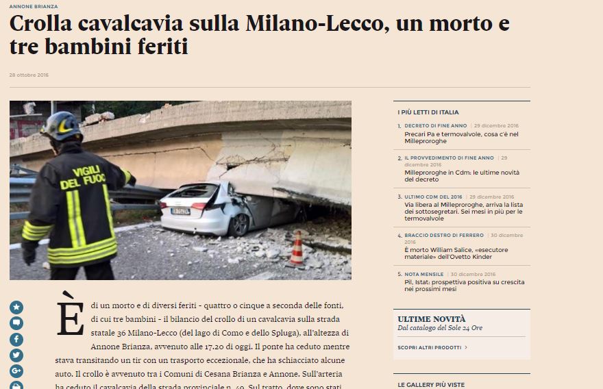 Un articolo pubblicato da Il Sole 24 Ore è in compulsiva condivisione, e parla del crollo di un cavalcavia sulla Milano-Lecco. Il bilancio è di un morto e diversi feriti.