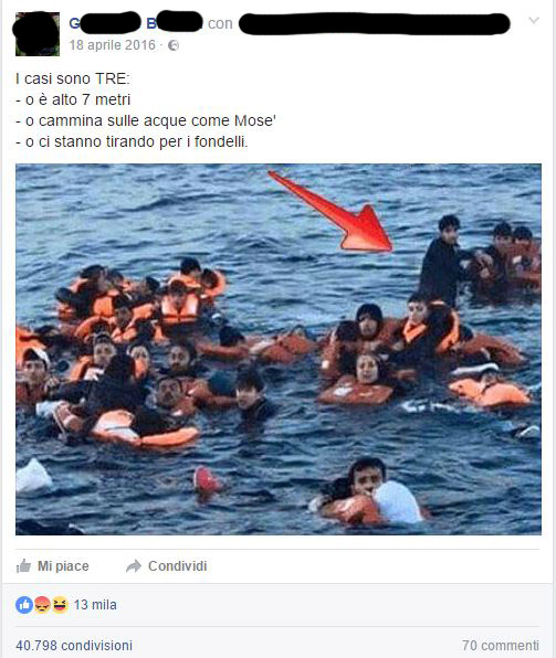 Sul suo account Twitter ufficiale il Co.I.S.P., Sindacato di Polizia, pubblica un’immagine che circola da mesi sui social network, utilizzata da chi vuol far credere che le drammatiche immagini dei naufragi dei migranti siano frutto di una “propaganda mediatica”. La foto documenta il naufragio di un’imbarcazione avvenuto nel Mare Egeo a dicembre 2015, a causa del quale hanno perso la vita almeno quattro bambini. Il Co.I.S.P. riprende la tesi di chi, nello scatto, ha notato un ragazzo che non sembra in difficoltà come i suoi sfortunati compagni di viaggio. E su questa disparità costruisce un sarcasmo che ha indignato non pochi utenti: “I casi sono tre – si legge nella dida della foto -. O è alto 7 metri, o cammina sulle acque come Mosè, o ci stanno tirando per i fondelli”. L’immagine invece corrisponde al vero, come testimonia anche un video girato dalla guardia costiera turca che ha effettuato le operazioni di soccorso: quel giorno sono stati messi in salvo 60 siriani.