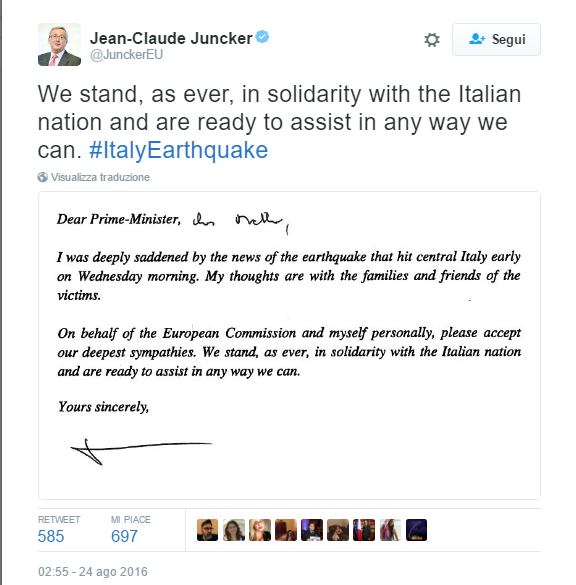 Juncker. «Siamo, come sempre, solidali con la nazione italiana e siamo pronti a fornire assistenza in qualsiasi modo possiamo» ha scritto il presidente della Commissione Ue, Jean-Claude Juncker, al premier Matteo Renzi, dicendosi «profondamente rattristato dalla notizia del terremoto che ha colpito l’Italia centrale».