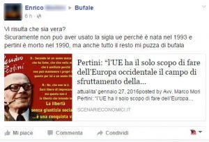 Nel post condivide un articolo del sito Scenarieconomici.it dal titolo “Pertini: l’UE ha il solo scopo di fare dell’Europa occidentale il campo di sfruttamento della finanza americana” e la frase attribuita a Pertini è la seguente:
