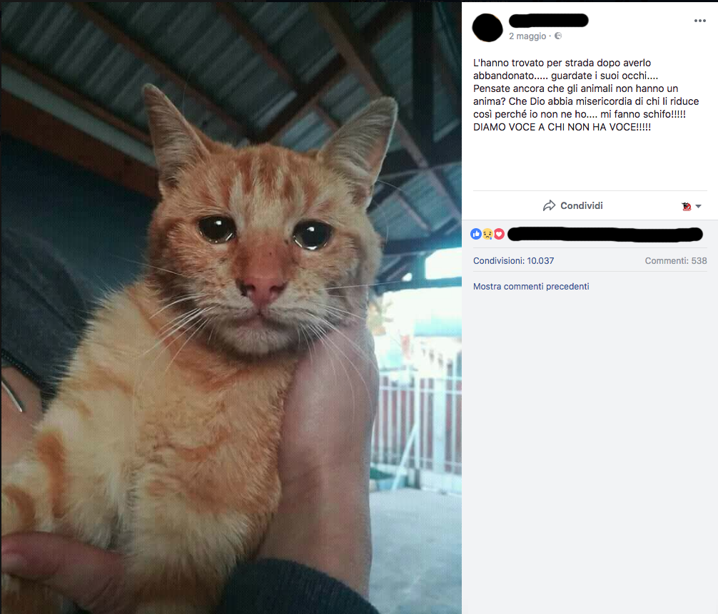 La tentazione di rileggere la foto vedendovi un gattino triste è evidente. È un errore comune, che potrebbe pensare che un gatto “coi lucciconi” stia semplicemente esprimendo un sentimento.