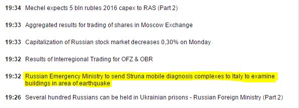 Andiamo avanti. Le precisazioni sulla posizione di Putin riguardo il terremoto in Italia sono state già chiarificate in questo nostro articolo. Ora, però, si parla di aiuti effettivamente pervenuti. Il riferimento all’invio di dispositivi di diagnostica Struna da parte del Ministro per l’Emergenza russo, con l’intento di esaminare gli edifici nei luoghi del terremoto, è vero ed è riportato da Interfax: