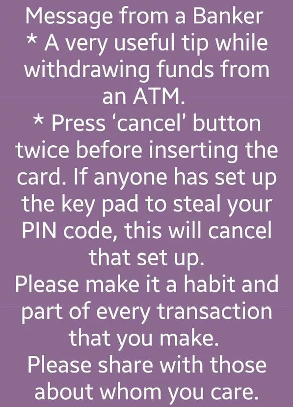 Premere sempre il pulsante “annulla” due volte prima di inserire la scheda nel bancomat. Se qualcuno ha impostato il tastierino per rubare il codice PIN, questo annullerà l’impostazione. Per favore, rendilo un’abitudine di ogni transazione che fai. Per favore condividi con quelli a cui tieni.