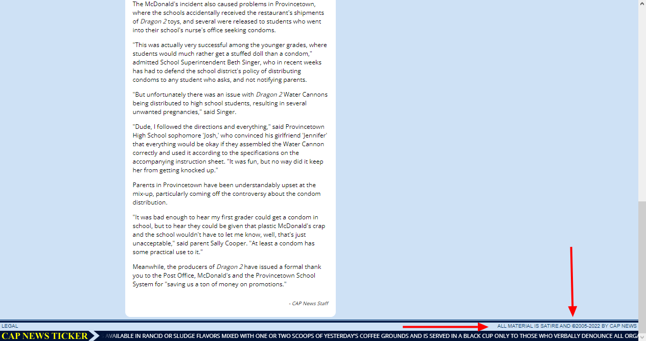 “All material is satire”. In pratica, tutti i contenuti pubblicati da Cap News sono satirici. Eppure il nostro spirito critico ci insegna che dietro le bugie (leggasi “bufale” o “articolo satirico”) si nasconderebbe un fondo verità.