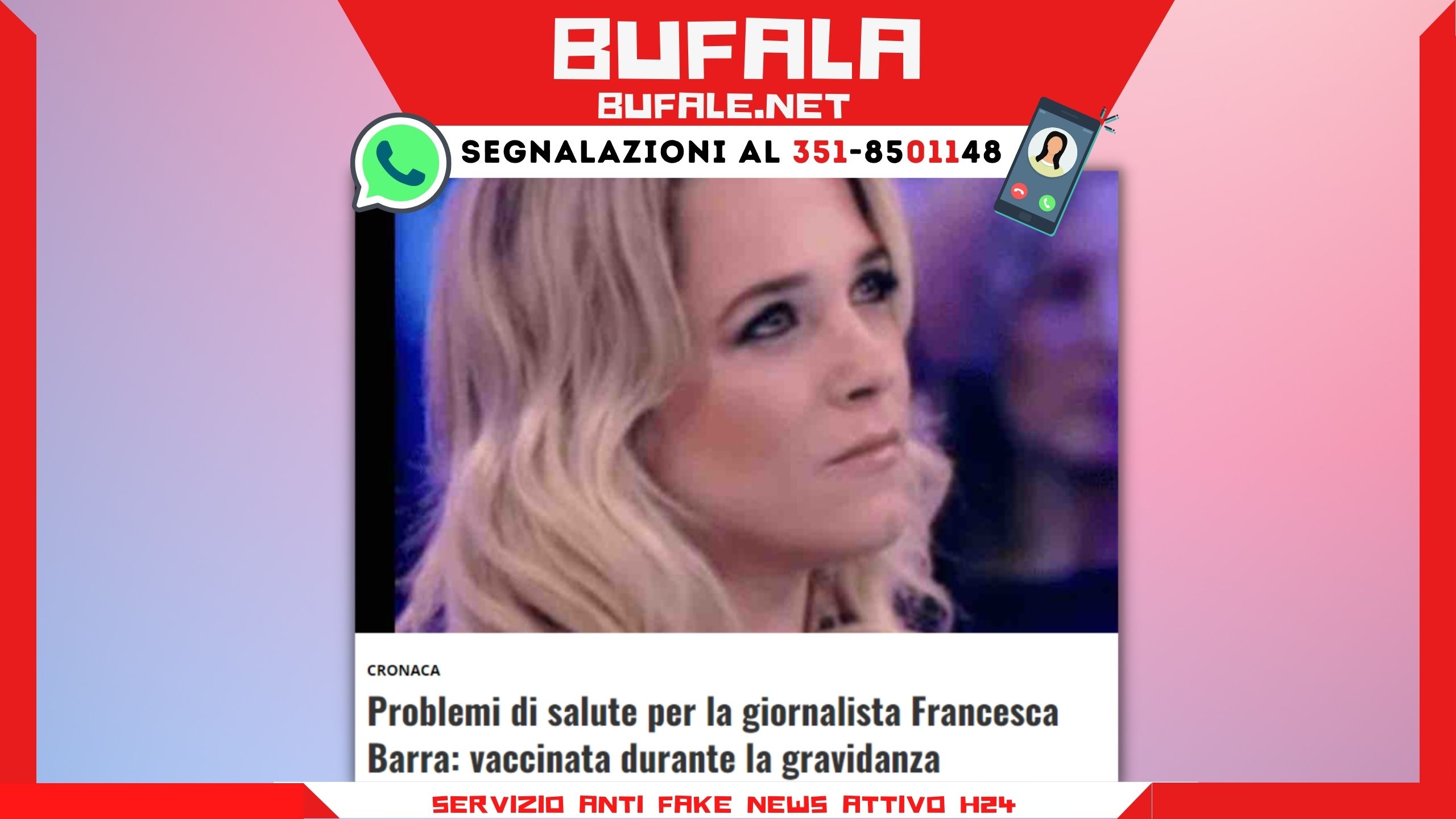 La giornalista Francesca Barra, vaccinata durante la gravidanza, avrebbe avuto problemi di salute. Questo è quanto riporta un articolo di Stop Censura pubblicato l’8 giugno sotto il titolo: “Problemi di salute per la giornalista Francesca Barra, vaccinata durante la gravidanza”. Nel testo gli autori correggono il tiro, ma la diretta interessata è prontamente intervenuta per chiedere la rimozione del pezzo.