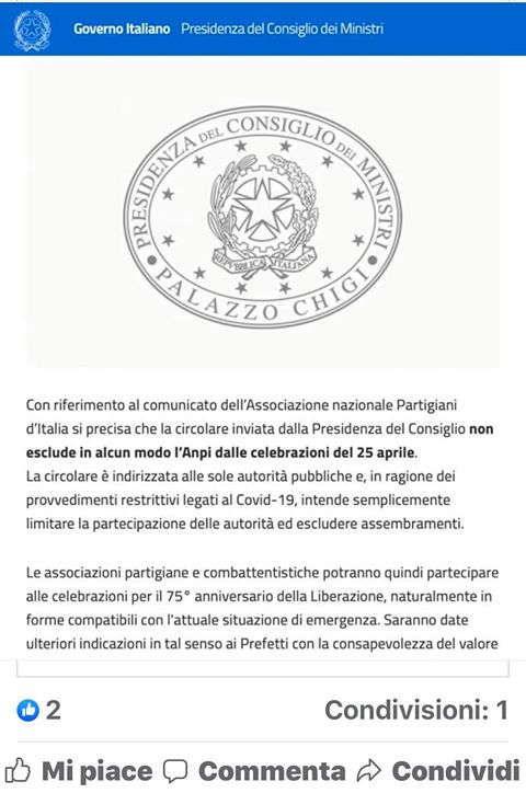 Con riferimento al comunicato dell’Associazione nazionale Partigiani d’Italia si precisa che la circolare inviata dalla Presidenza del Consiglio non esclude in alcun modo l’Anpi dalle celebrazioni del 25 aprile.