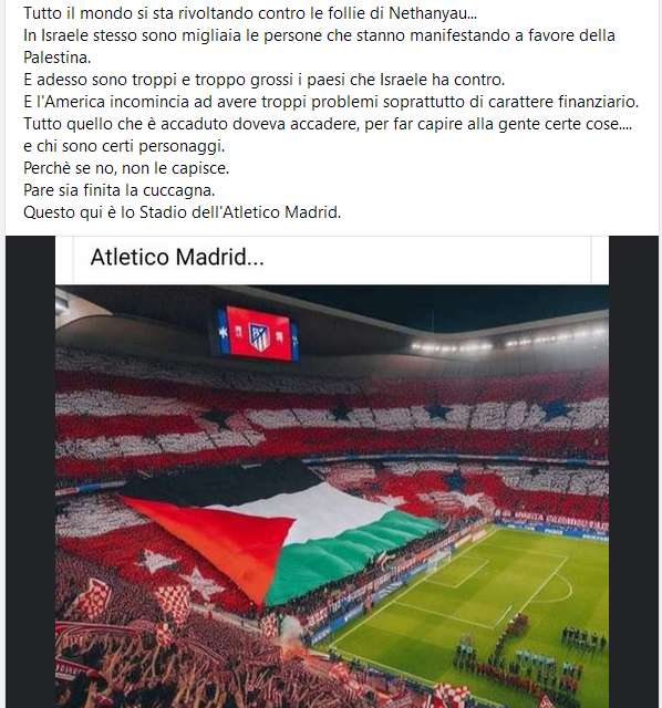 Ci risiamo: una foto della bandiera palestinese allo stadio creata con AI ci mostra che se gli uomini del 1920 sognavano un futuro in cui la scienza ci avrebbe portato lontano dalla Grande Guerra e pronti a sconfiggere orrori e malattie, noi uomini del 2023 abbiamo deluso le loro aspettative usando strumenti evolutissimi per portare la frase “Eh, ma tanto è il concetto quello che conta” a livello di farsa.