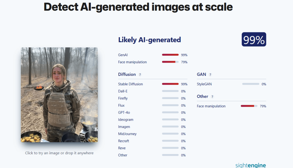 Ci segnalano i nostri contatti la foto di una soldatessa ucraina in lacrime, apparsa su un post Facebook e su un post X (che è l’origine di tutto). Si tratta del tipico caso di Slop, contenuti creati dall’intelligenza artificiale per ottenere la massima viralità con la minima fatica.