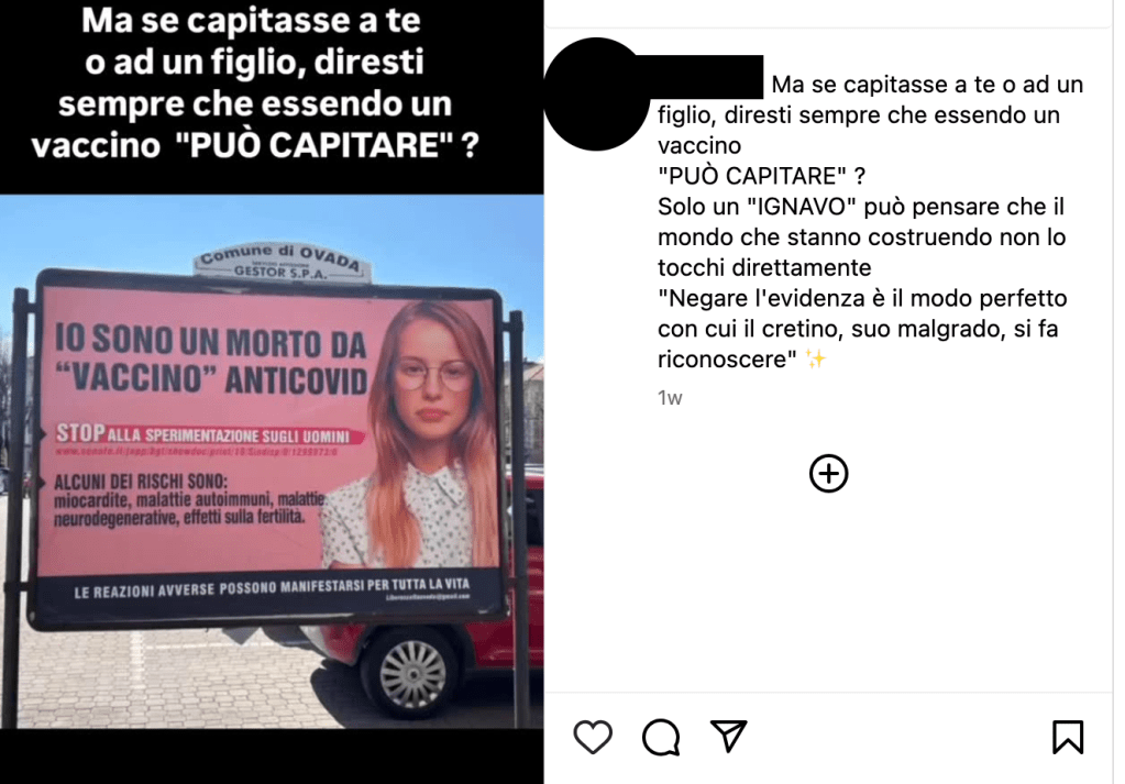 Il manifesto è stato pubblicato su Instagram, una foto di un manifesto affisso sulla pubblica via che raffigurerebbe una “vittima da vaccino” con una didascalia “ragebait” che incita il lettore a provare rabbia e condividere immaginando lo scenario di una figlia “morta di vaccino” come la donna nel video e persone che dicano ai sopravvissuti che “può capitare”.