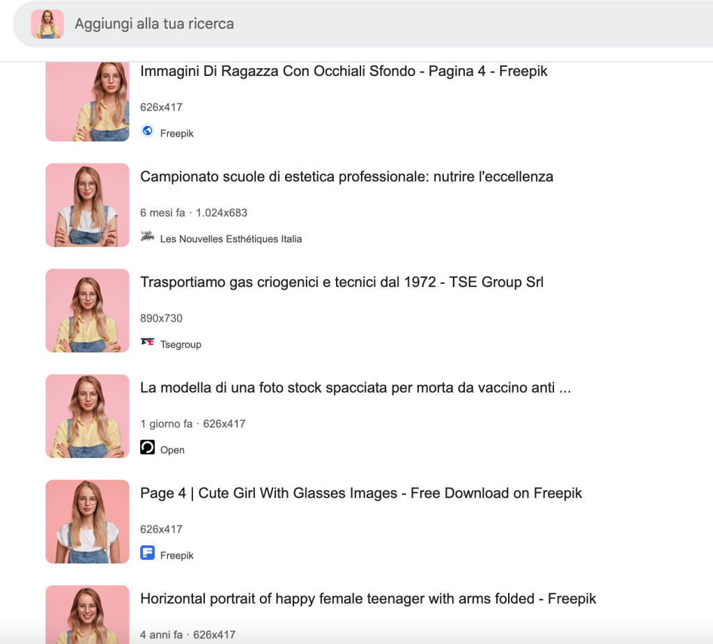 “Stranamente” abbiamo trovato su Freepik, aggregato di foto liberamente usabili, una donna con lo stesso viso e posa, nonché una serie di tool potenziati dall’IA per cambiare una serie di dettagli, il che giustifica come cercando la stessa fanciulla nei motori di ricerca, l’abbiamo vista nella stessa posa, con la stessa espressione e diversi vestiti.