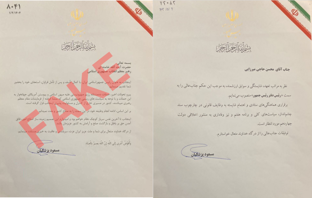 Ovviamente sono tutti eventi non accaduti: non vi è traccia di comunicazioni ufficiali e, come evidenziato da fact checker locali, le intestazioni e la firma sono prese da un diverso documento, pubblicato a luglio dello scorso anno per la nomina di Mohsen Haji Mirzaei a capo dello staff del presidente dell’Iran.