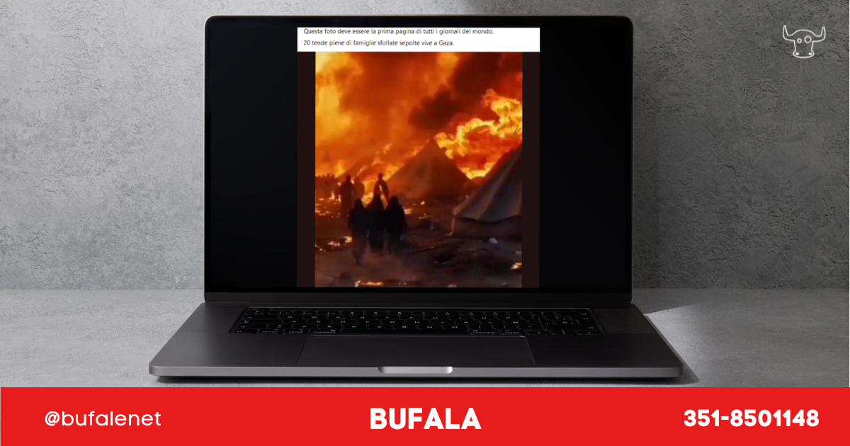 Ci segnalano i nostri contatti delle foto di tende in fiamme a Gaza, pubblicate su Facebook, X e Threads con una didascalia che chiede perché esse non siano sulle prime pagine dei giornali.