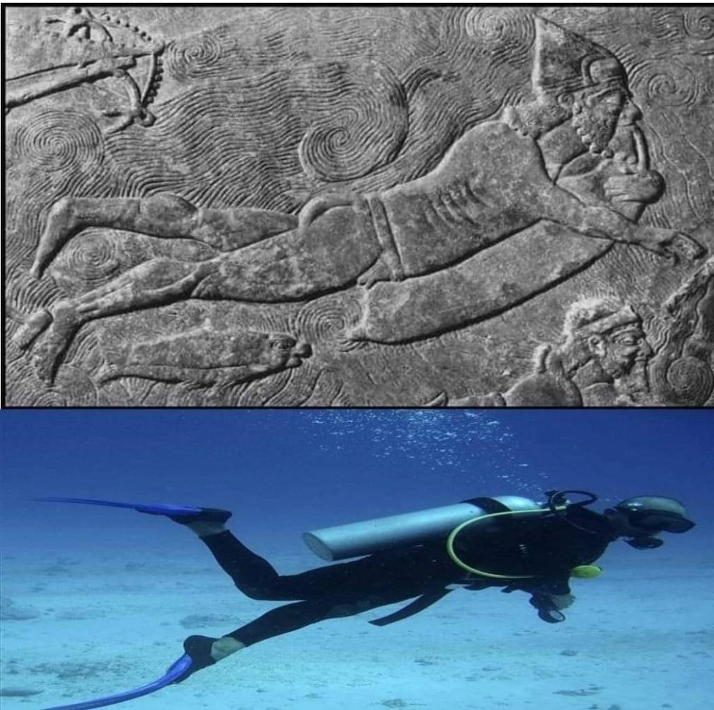 Il bassorilievo, custodito al British Museum, descrive l’attraversamento di un fiume, e solo per una questione artistica le figure sembrano immerse in acqua. In realtà ci sono soldati e carri che guadano e nuotano a pelo dell’acqua. Cosa che si può notare dalla presenza di un cavallo al di sotto del presunto sommozzatore.